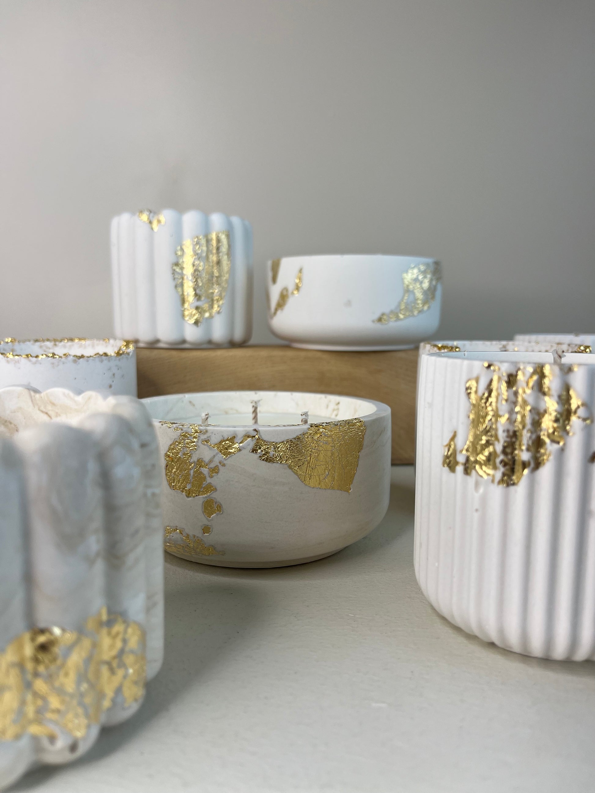 Contenant : Jesmonite moulé à la main, feuilles d’or