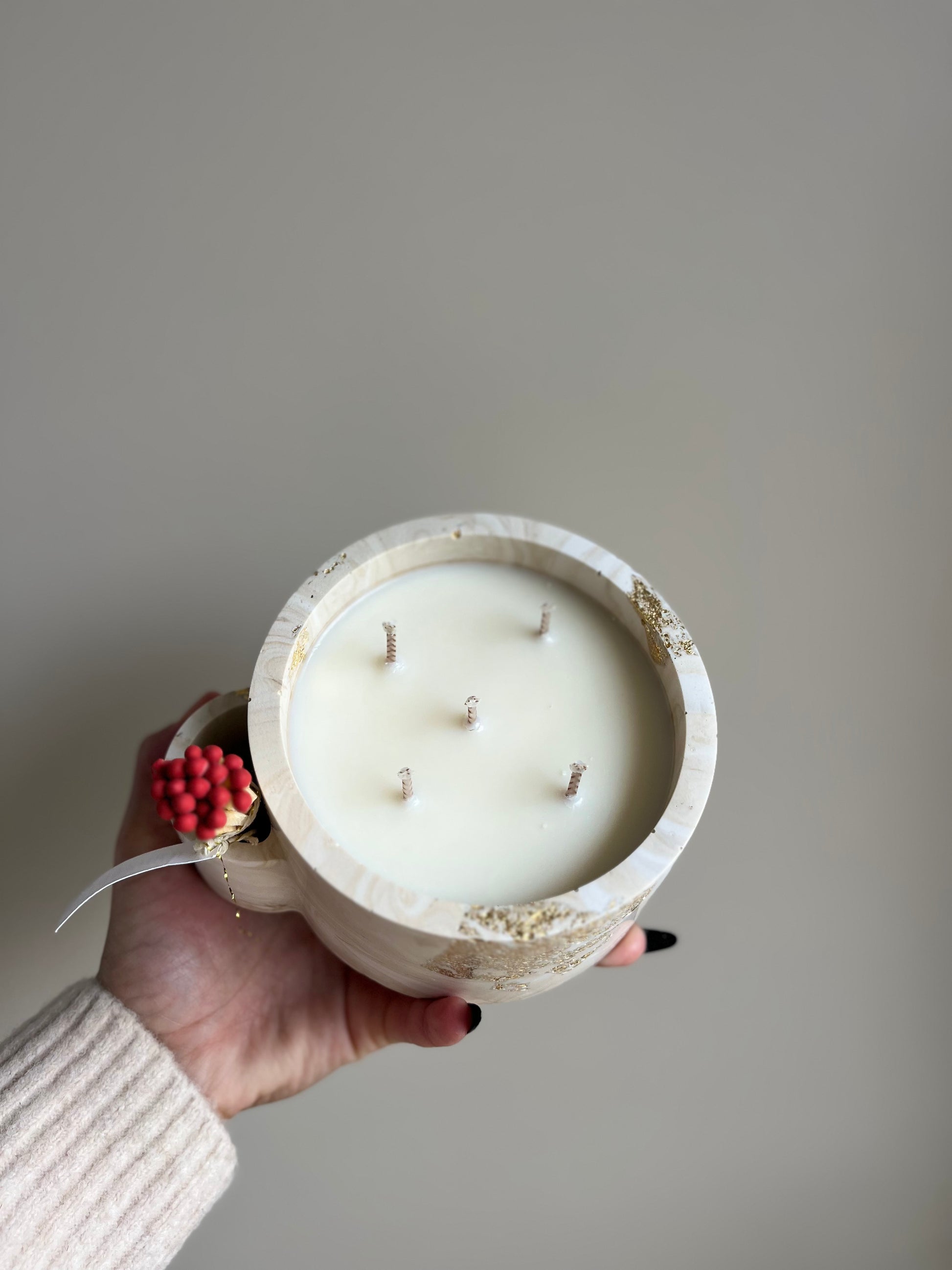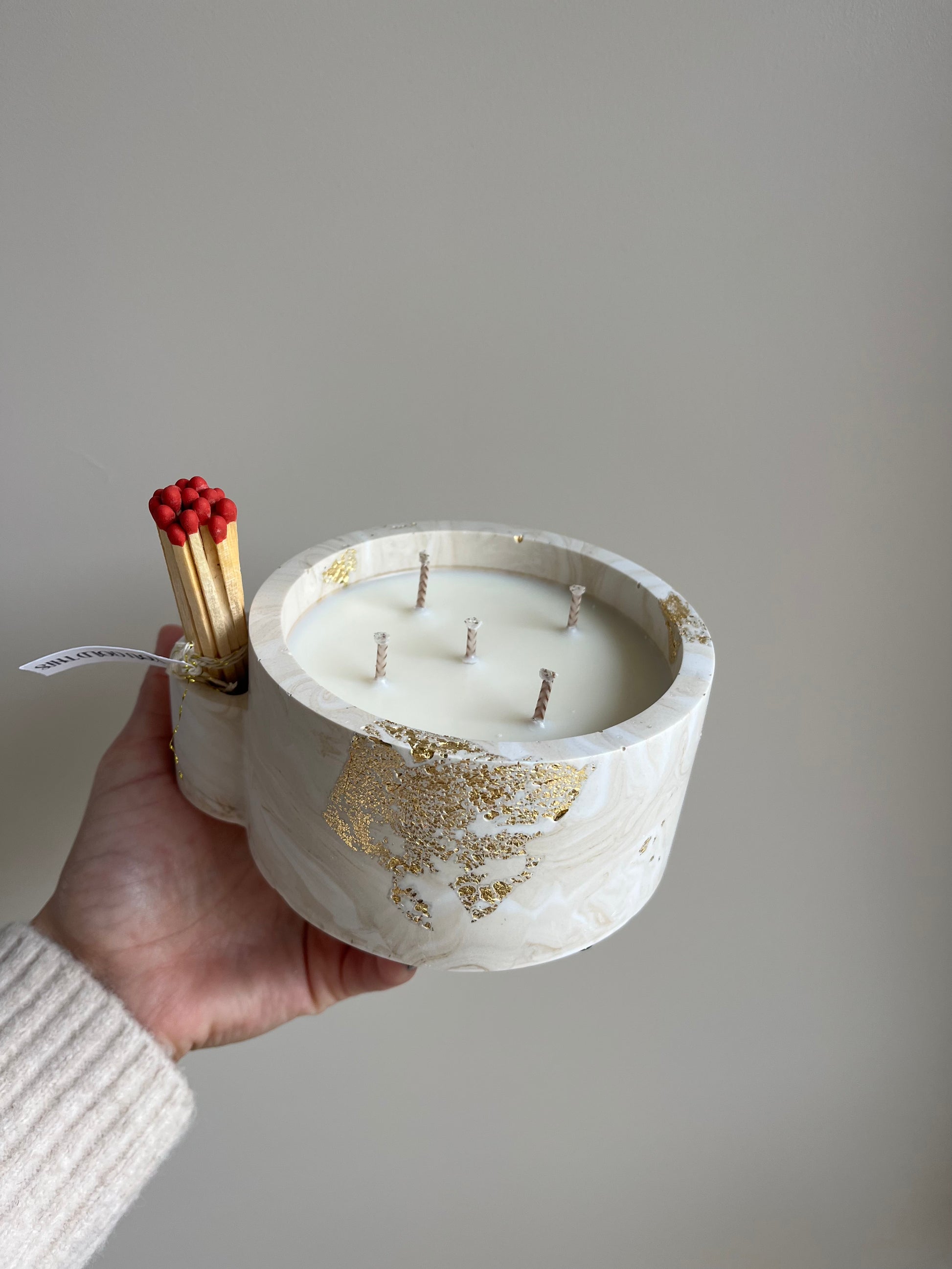 Coulée à la main dans mon atelier, chaque bougie est unique : pot moulé en Jesmonite (résine naturelle à base d’eau), feuilles d’or posées à la main, et accompagnée de son porte-allumettes et de ses allumettes. Un bel objet à contempler ou à offrir, et à réutiliser une fois la cire terminée : porte-bijoux, décoration… Laisse parler ton imagination ou trouve de l’inspiration sur notre compte Instagram @yougoldthis.