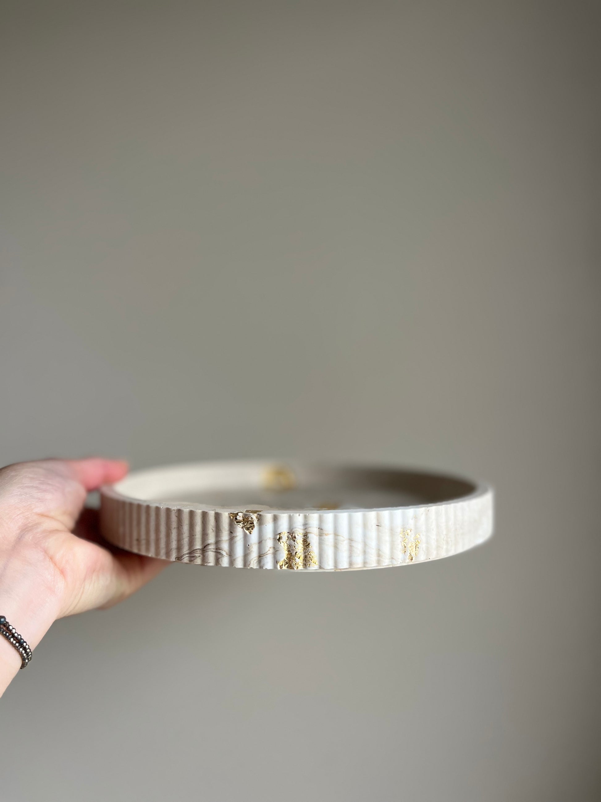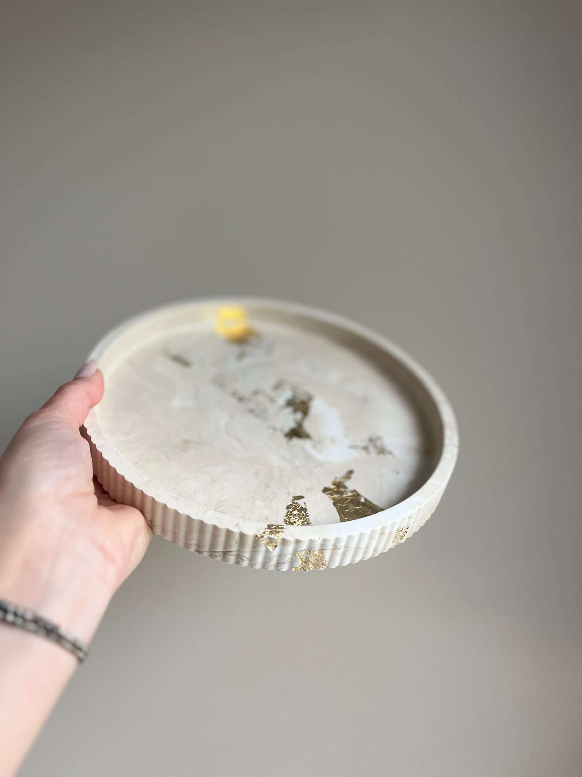 Ce grand plateau ondulé fait main, fabriqué en Jesmonite et sublimé à la feuille d’or, est bien plus qu’un simple objet déco. C’est une pièce unique, pensée pour illuminer ton intérieur et refléter toute ta personnalité.
