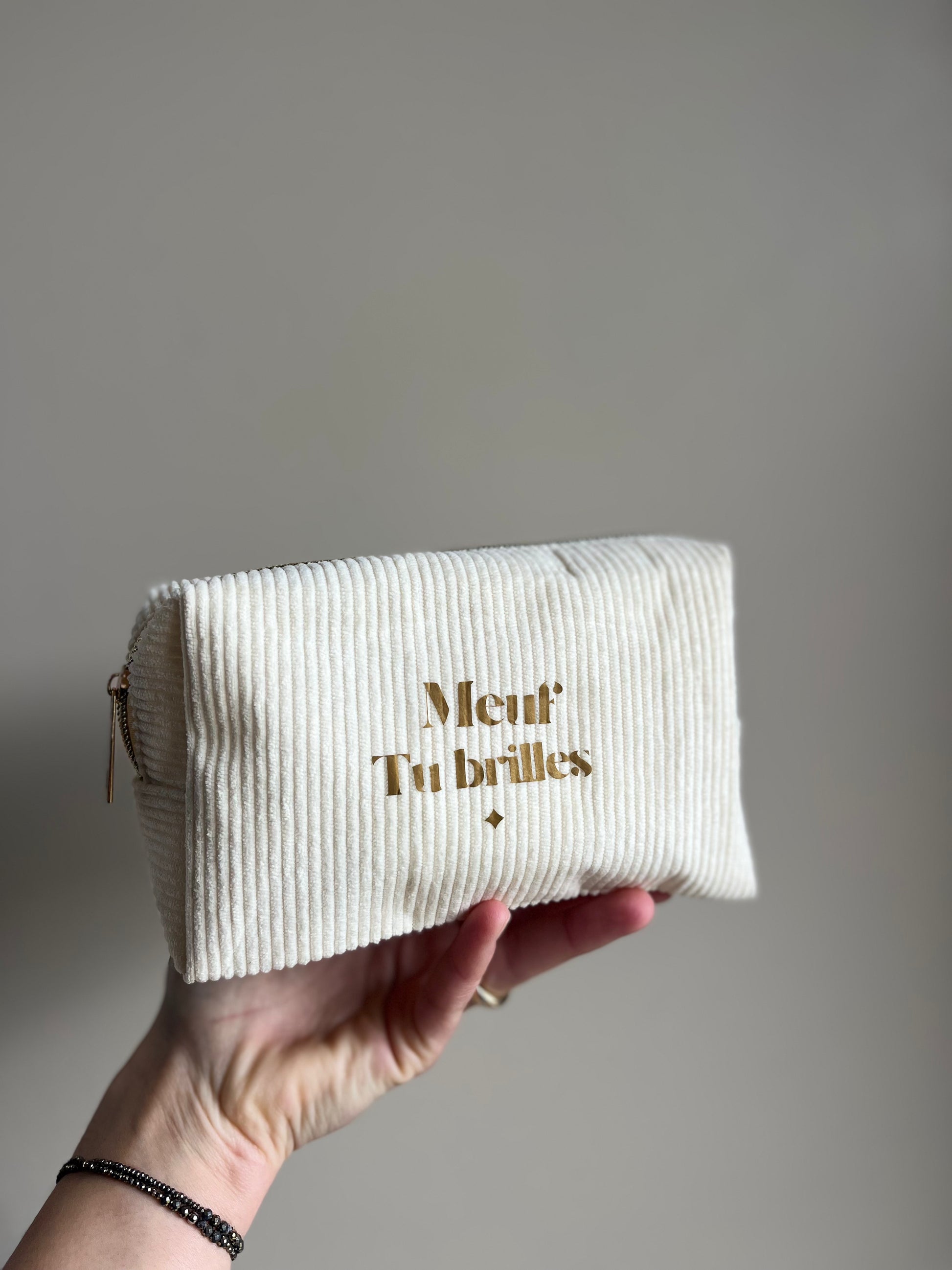Douce, élégante et inspirante. La trousse velours beige « Meuf tu brilles » est parfaite pour ranger tes essentiels avec style et audace.