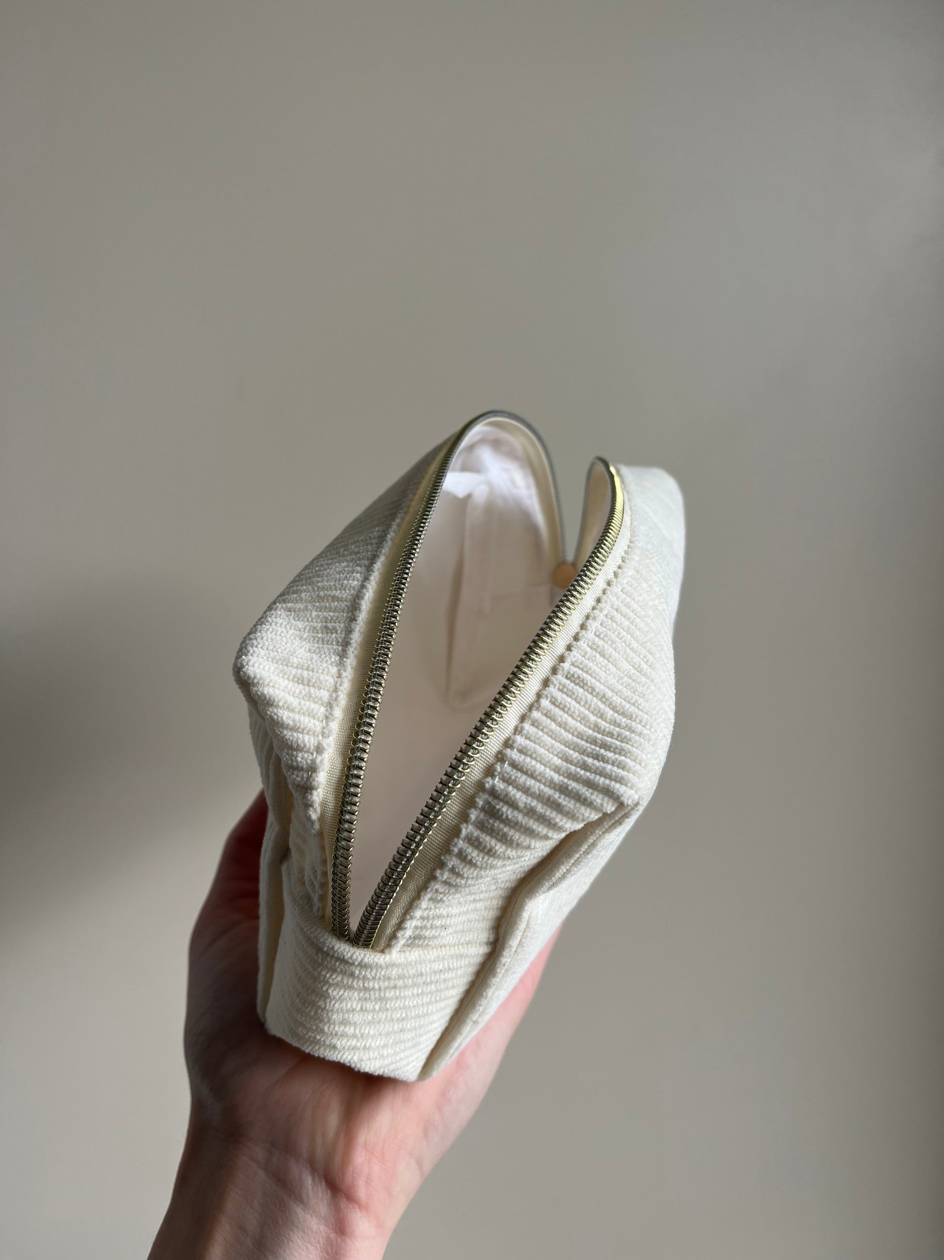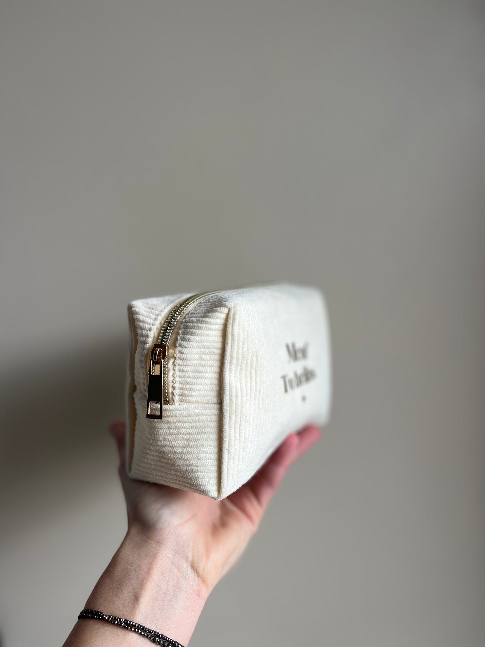 Trousse velours beige « Meuf tu brilles » – Trousse maquillage chic et féminine You Gold This